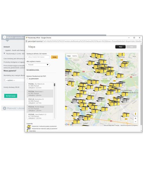 - Dodatek uruchamia widget w kasie na stronie formy dostawy, dzięki któremu klient może wybrać miejsce dostawy.